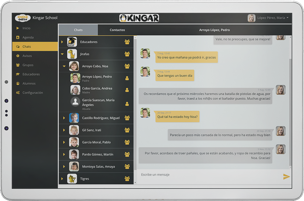 Envíe y reciba mensajes, de los familiares o de los otros educadores, sin la necesidad de dar a conocer los números personales ni tener que gestionar grupos.