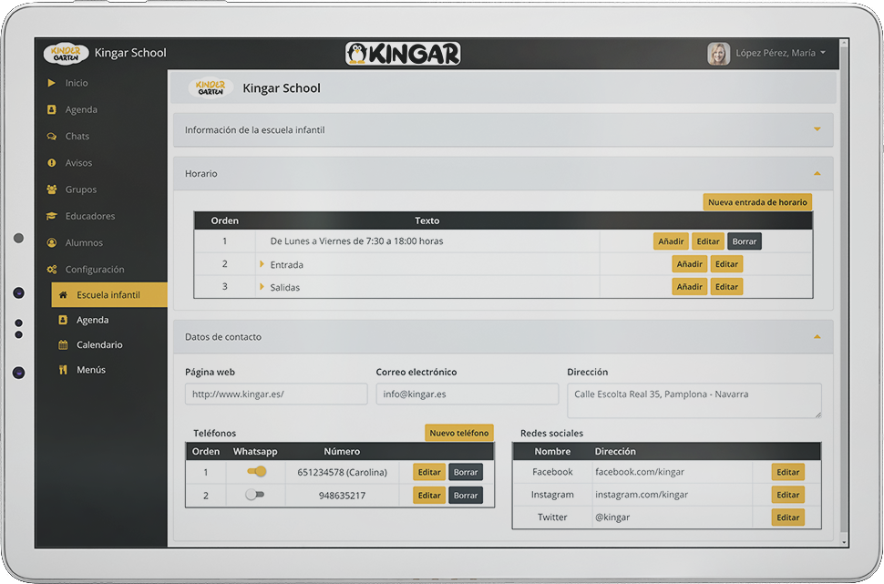 La información de contacto de la escuela infantil (horario, dirección, página web, correo electrónico,...) estará siempre disponible.