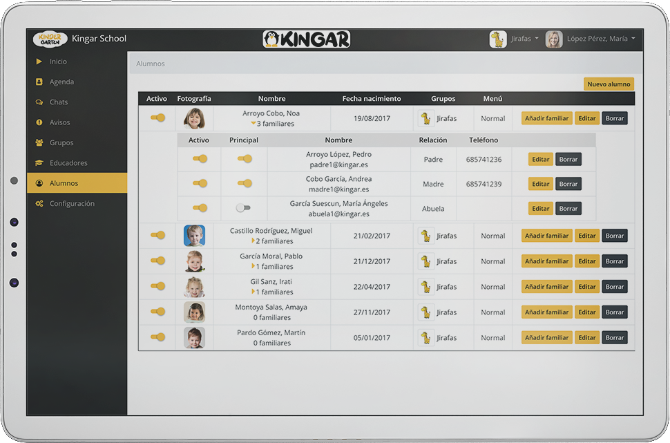 Defina los grupos, los educadores, los alumnos de cada grupo y los familiares de cada alumno. Olvidése de la gestión de accesos, ya que nada más crear los educadores y los familiares recibiran sus credenciales para poder acceder a la plataforma Kingar.