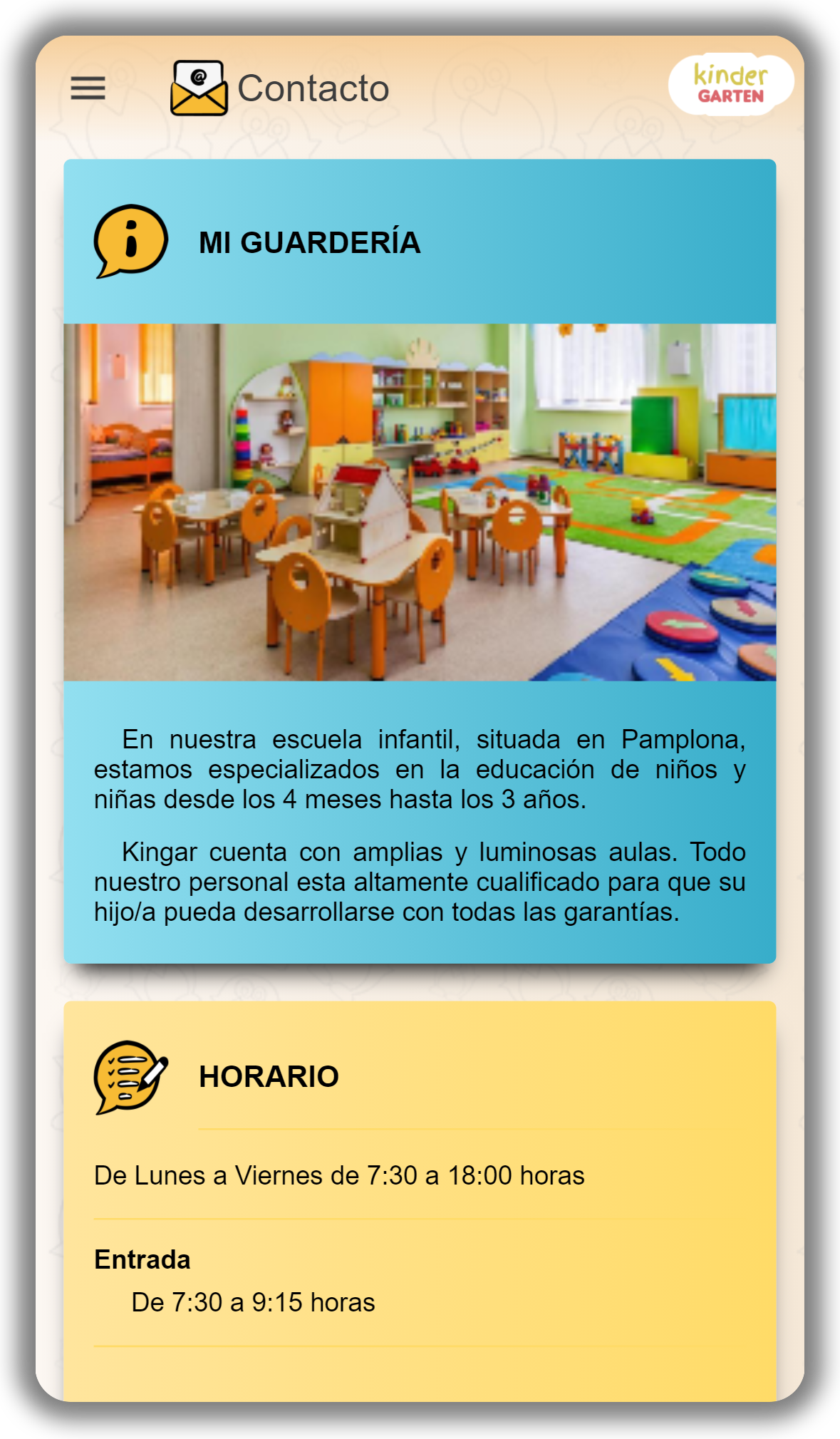 La información de contacto de la escuela infantil (horario, dirección, página web, correo electrónico,...) está siempre disponible.