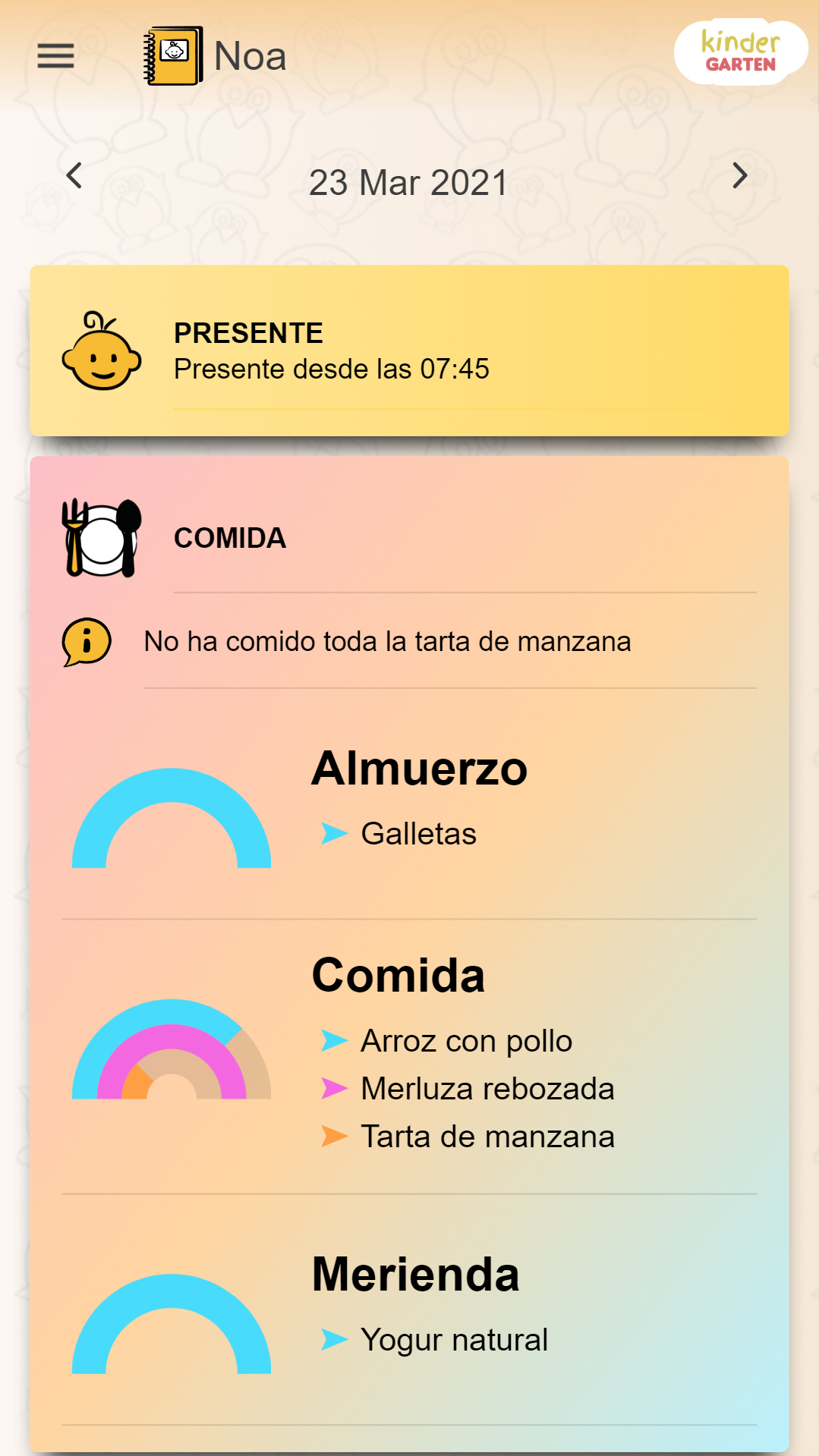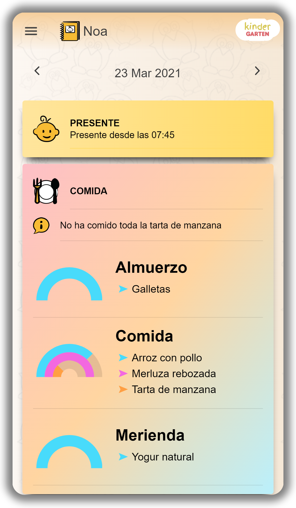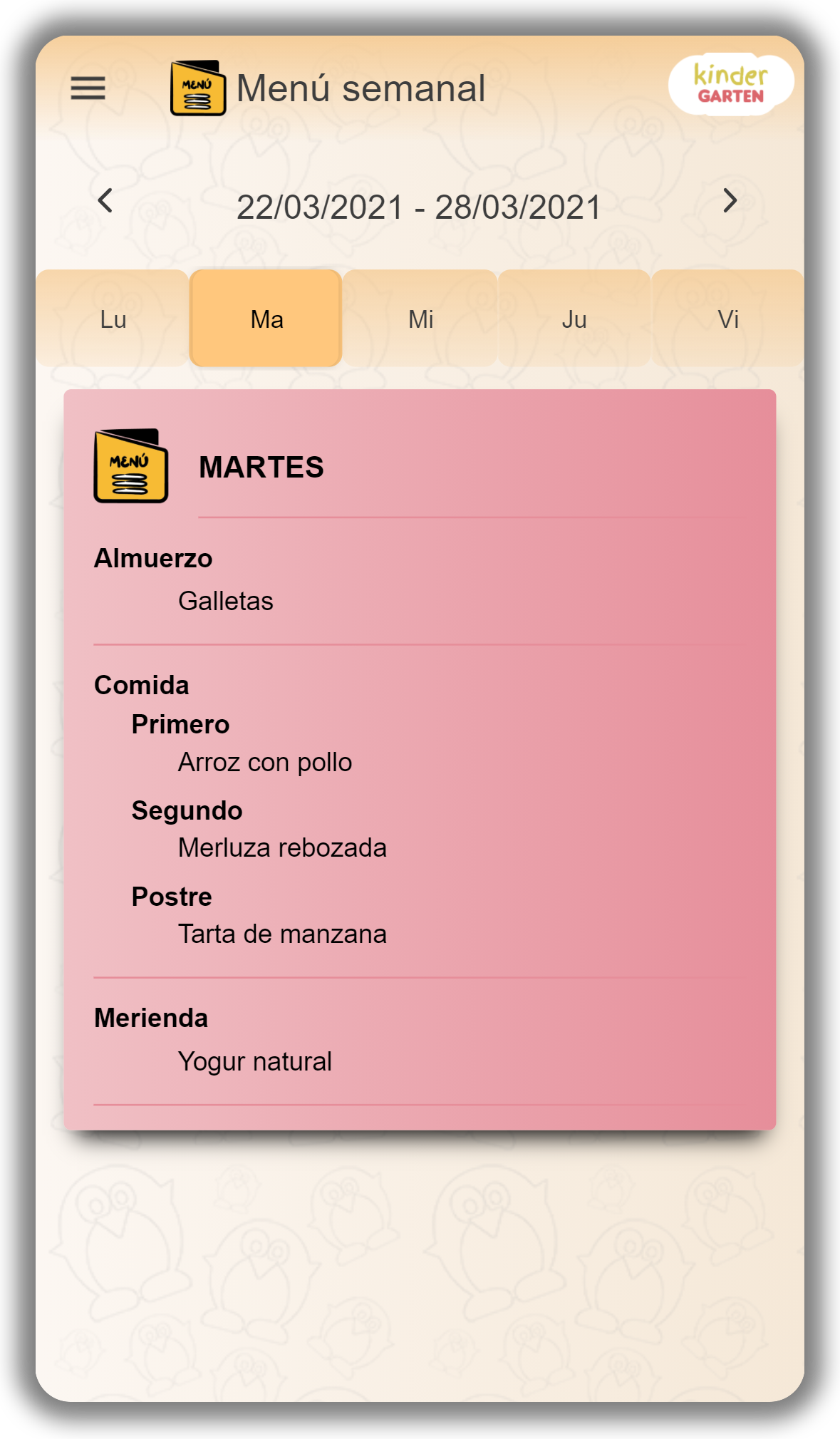 La aplicación ofrece la posibilidad de consultar el menú semanal del alumno y el calendario de la escuela infantil.